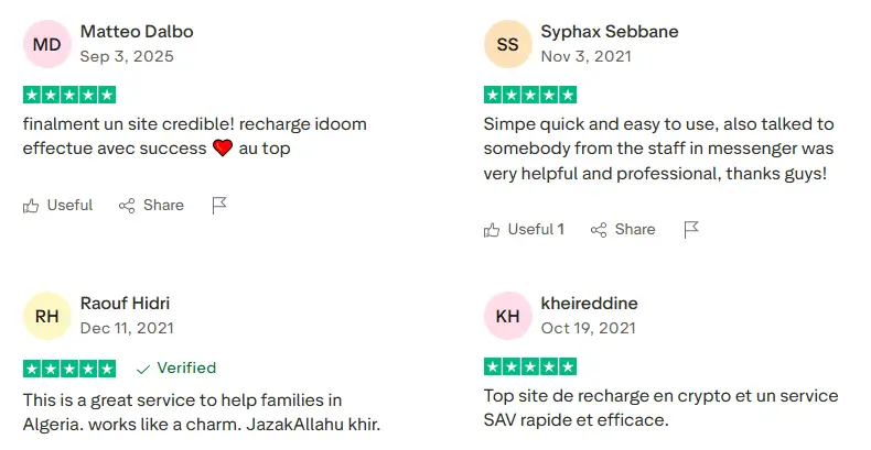 Buy Mobile Top-Ups, Internet Gift Cards, Pay Utility Bills with Fast & Secure Digital Payments to Algeria Shop now Internet & Mobile Top Ups Flexy – Mobilis Ooredoo Djezzy 1.70$ – 15.59$Price range: 1.70$ through 15.59$ Sale! Recharge idoom ADSL / Fibre 2.84$ – 14.60$Price range: 2.84$ through 14.60$ Sale! TopUp idoom 4G 2.84$ – 32.03$Price range: 2.84$ through 32.03$ Utility Bills ADE 0.01$ Algerie Telecom 0.01$ Sonelgaz 0.01$ Games Sale! PUBG Mobile UC TopUp 0.98$ – 93.24$Price range: 0.98$ through 93.24$ Sale! Free Fire TopUp (Global) 2.32$ – 21.00$Price range: 2.32$ through 21.00$ Sale! XBOX Live Gift Card (USA) 5.50$ – 98.00$Price range: 5.50$ through 98.00$ Sale! Mortal Kombat 11 Ultimate Edition Key (Global) 59.99$ Original price was: 59.99$.8.50$Current price is: 8.50$. Electronic Money USDT 6.50$ – 56.00$Price range: 6.50$ through 56.00$ Payeer 6.00$ – 55.50$Price range: 6.00$ through 55.50$ RedotPay 6.00$ – 55.50$Price range: 6.00$ through 55.50$ WebMoney 5.00$ – 50.00$Price range: 5.00$ through 50.00$ Pay securely Pay with Crypto (Bitcoin, USDT, LTC, …), PayPal, Payeer, WebMoney … Fast and secure payments Order followup via Email Team support available 7/7 No hidden fees TrustPilot Reviews Shop now